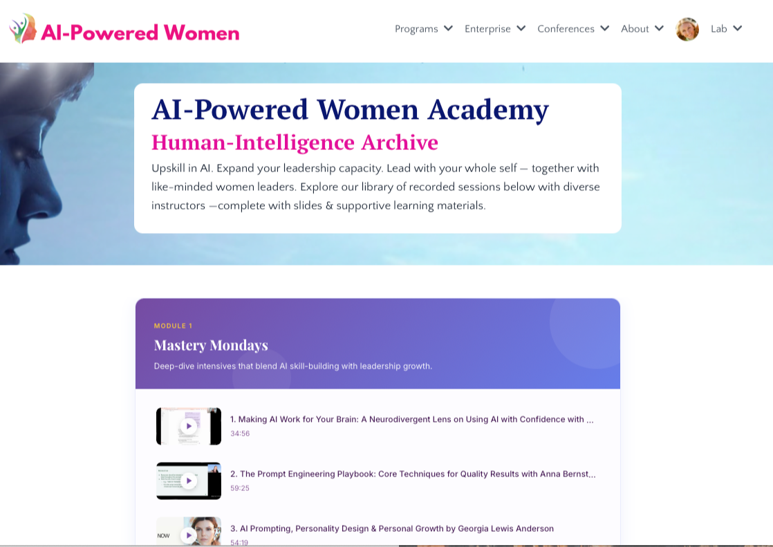 AI-Powered Women Academy is a live, market-responsive learning platform designed for continuous AI-driven change. Unlike static AI training, programming evolves weekly to reflect new model releases, enterprise features, governance shifts, and real-world use cases. This ensures leadership capability evolves as quickly as the AI landscape — while retaining and advancing high-performing women leaders during a time of profound workforce disruption.